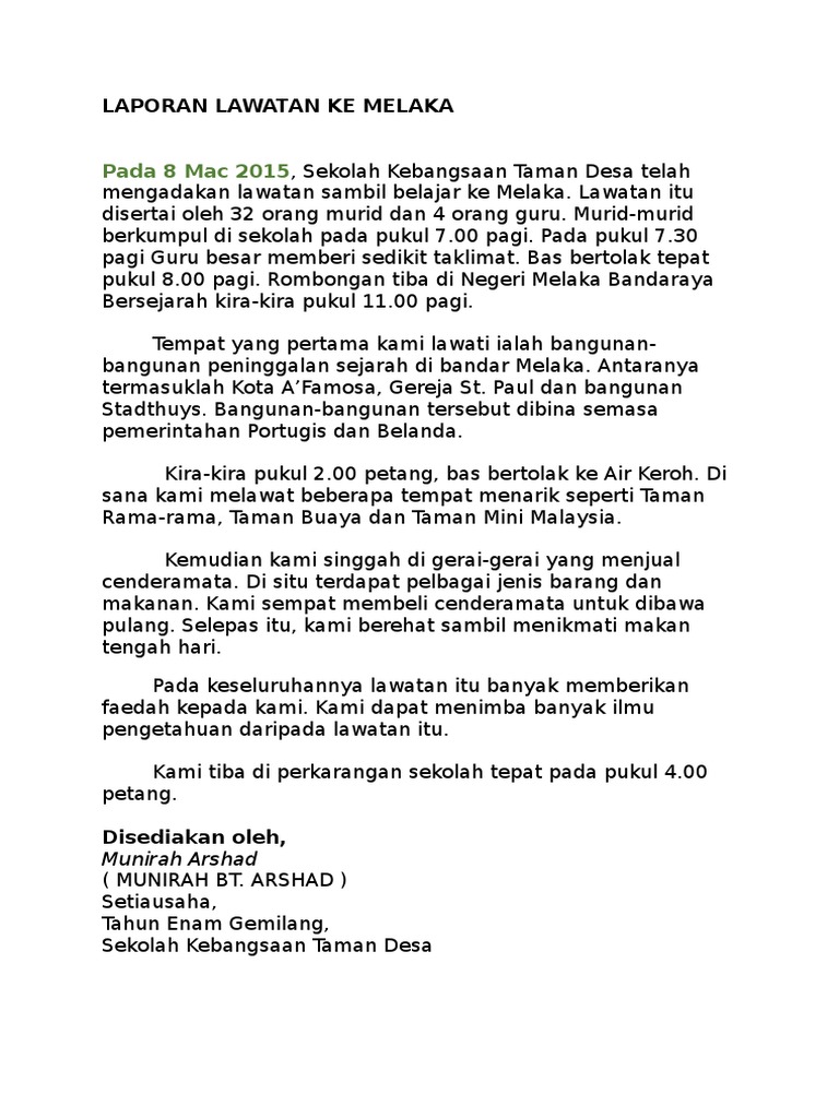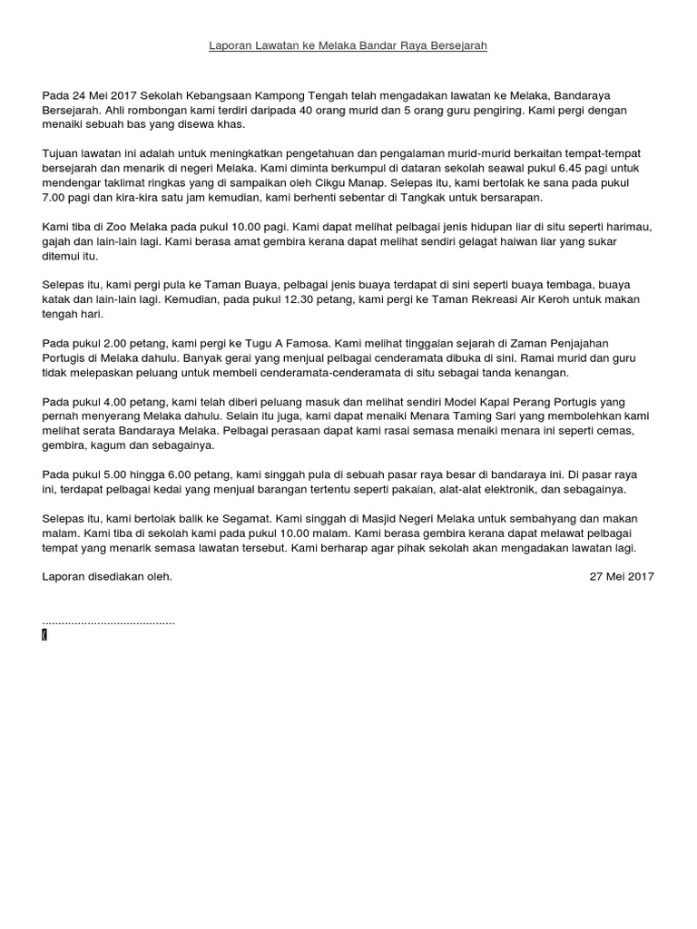 Laporan Lawatan Ke Melaka / Pada tanggal 20 mei 2015 yang lalu, lawatan sambil belajar ke bangunan parlimen di kuala lumpur telah diadakan yang melibatkan seramai 40 pelajar daripada persatuan bahasa malaysia sekolah menengah kebangsaan invictus, melaka.. Sudaroli valaiyoli 3 months ago. 1 laporan lawatan sambil belajar ke melaka sk sultan abdul aziz kg kuantan 1.0 nama program program pendidikan luar bilik darjah (plbd) (lawatan ke melaka ) bersama ibubapa dan guru anjuran kelas prasekolah sk sultan abdul aziz kg kuantan. Ramai guru yang berpendapat bahawa lebih baik lawatan ini ditunda pada masa yang lebih sesuai. Tuliskan satu laporan tentang lawatan tersebut. Laporan hari pertama lawatan di melaka17/10/2012 semua pelajar kedap bertolak ke pekan gerik pada pukul 8.00 pagi dari dala secara berkonvoi ke.