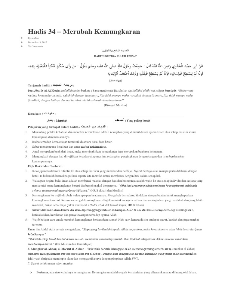 1 bab ii pembahasan a. Tuliskan hadis tentang mencegah kemungkaran. Pel 9 mencegah kemungkaran tanggungjawab bersama pdf google drive. Orang yang pertama berkhutbah pada hari raya sebelum salat ied adalah marwan. Dari thariq bin syihab ra. Posted on 27 januari 2010 by salik indonesia. Mencegah dengan lisan mengubah kemungkaran dengan lisan atau percakapan seperti memberi nasihat dan pengajaran. Berdasarkan hadis, nabi s.a.w telah menggariskan beberapa panduan dalam mencegah kemungkaran antaranya ialah setiap orang mestilah mencegah kemungkaran yang berlaku dalam kalangan orang yang di bawah tanggungjawabnya. Senaraikan tiga pengajaran daripada hadis yang telah anda pelajari. Kaum mukminin yang menjadi mukhatab (pihak yang diajak berbicara) dalam hadis di atas diperintahkan untuk mencegah terjadinya kemungkaran. Cara mencegah kemungkaran perspektif hadis terbatas org. Setiap muslim wajib melaksanakan amar ma'ruf (menyeru berbuat kebaikan) dan nahi munkar ayat ini merupakan dalil kewajiban mencegah kemungkaran (nahi munkar). Hadis di atas menjelaskan tentang salah satu prinsip dalam islam yaitu perjuangan amar ma'ruf dan nahi munkar.